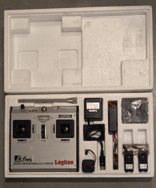 Digital proportionalt radiofjernstyrings anlæg fra Logitec på 35.010 MHz, bestående af en sender med stavantenne, en modtager, 2 stk. servo motorer, batteripakke 4,8V/450mAh til servoer og modtager, oplader til både sender og modtager, rem til senderen m.m.